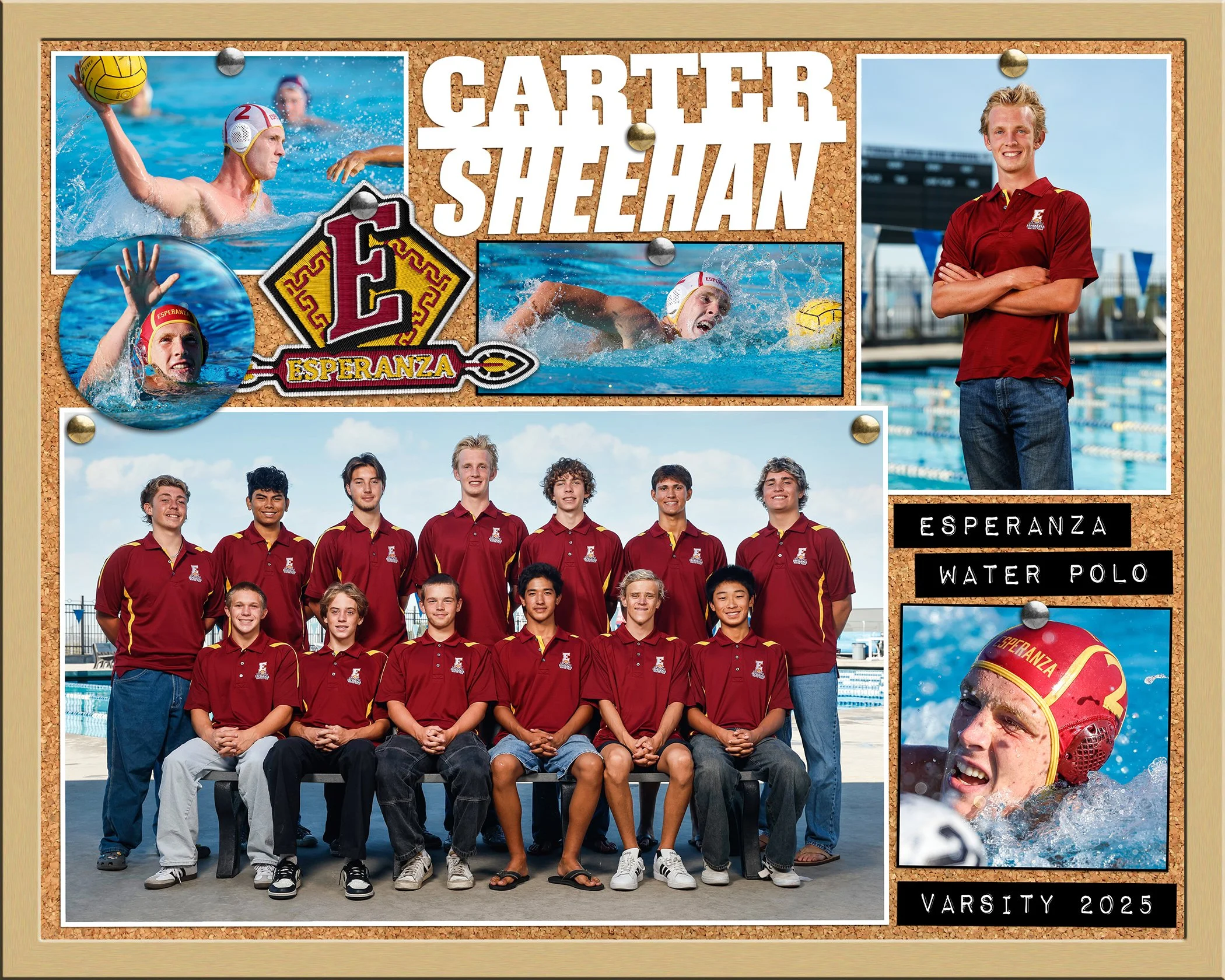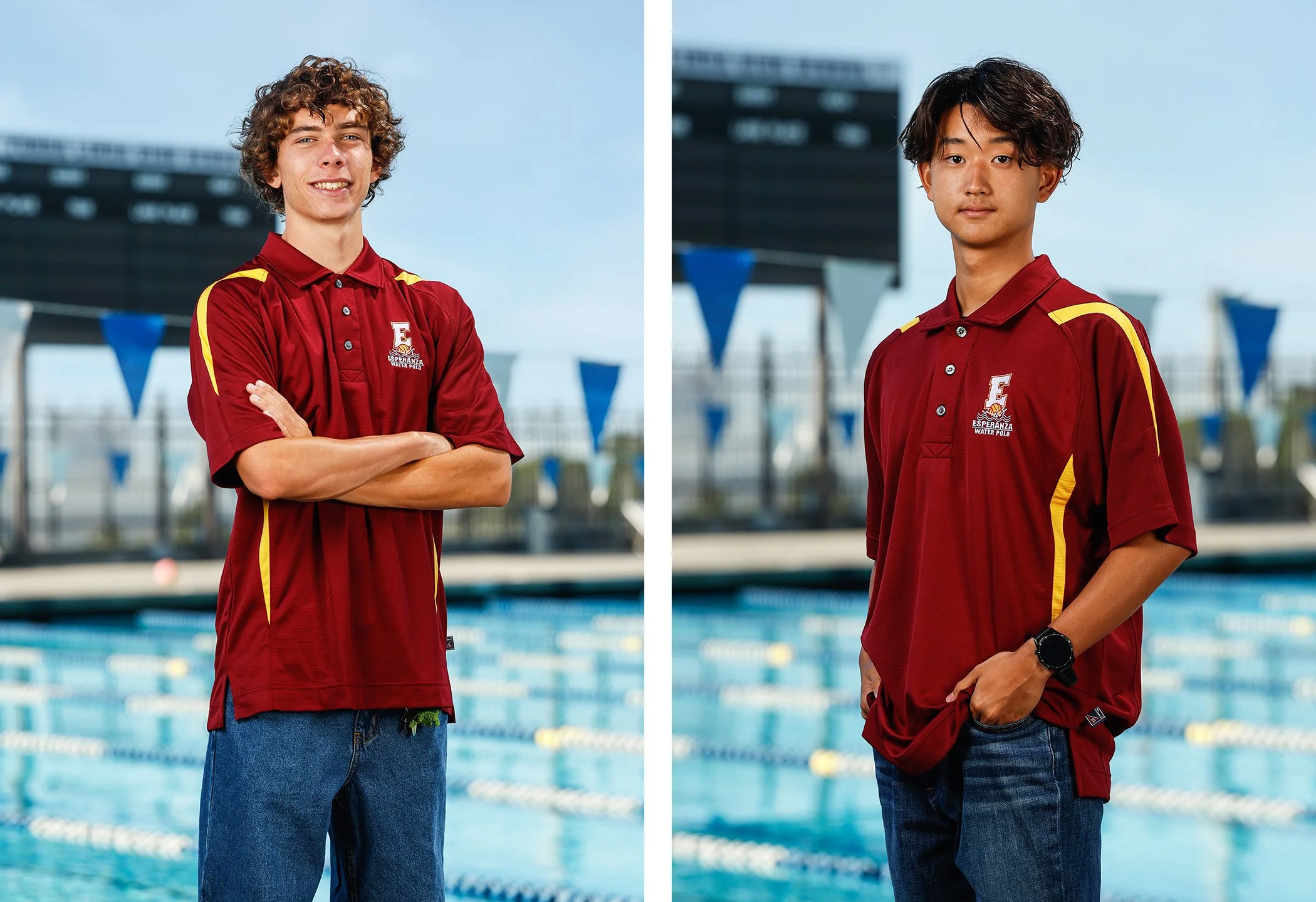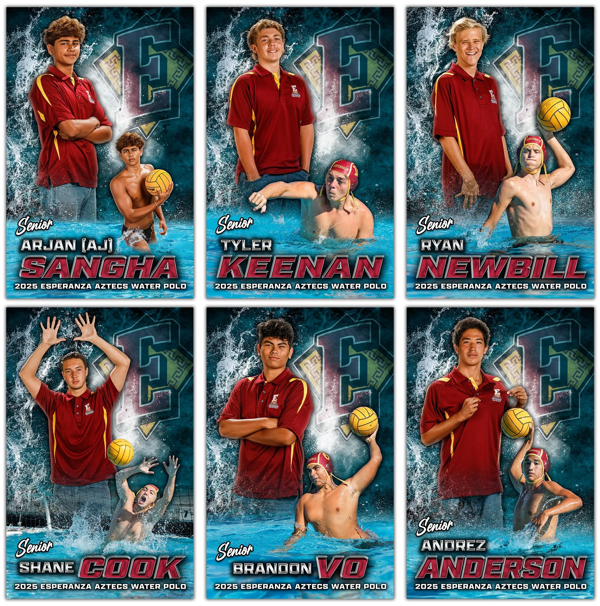 A little twist here. The Esperanza boys had to play over at Yorba Linda High School this season as their pool was being renovated. I touched on that before, but this time I knew where to be! My wife actually helped me on this shoot. We did this at 8:30 in the morning, and I wasn’t sure what the sun, shadows, and lighting would look like that early so I wanted to have a helper. As it turned out the sun conveniently cast a building shadow just long enough to cover a great spot, giving me a nice pool/scoreboard backdrop. With the teams being only 8 and 13 players, we did those shots there too on the cool team bench. I set up for green screen shots in the alcove and shot the seniors there. After that the boys jumped in the pool and gave me some action shots that I incorporated onto the banners. I didn’t change it much from last year (which I still haven’t posted! Maybe next!) I think this is a pretty solid look. Here is the 2025 Esperanza Water Polo Photo Day Gallery (CLICK). B