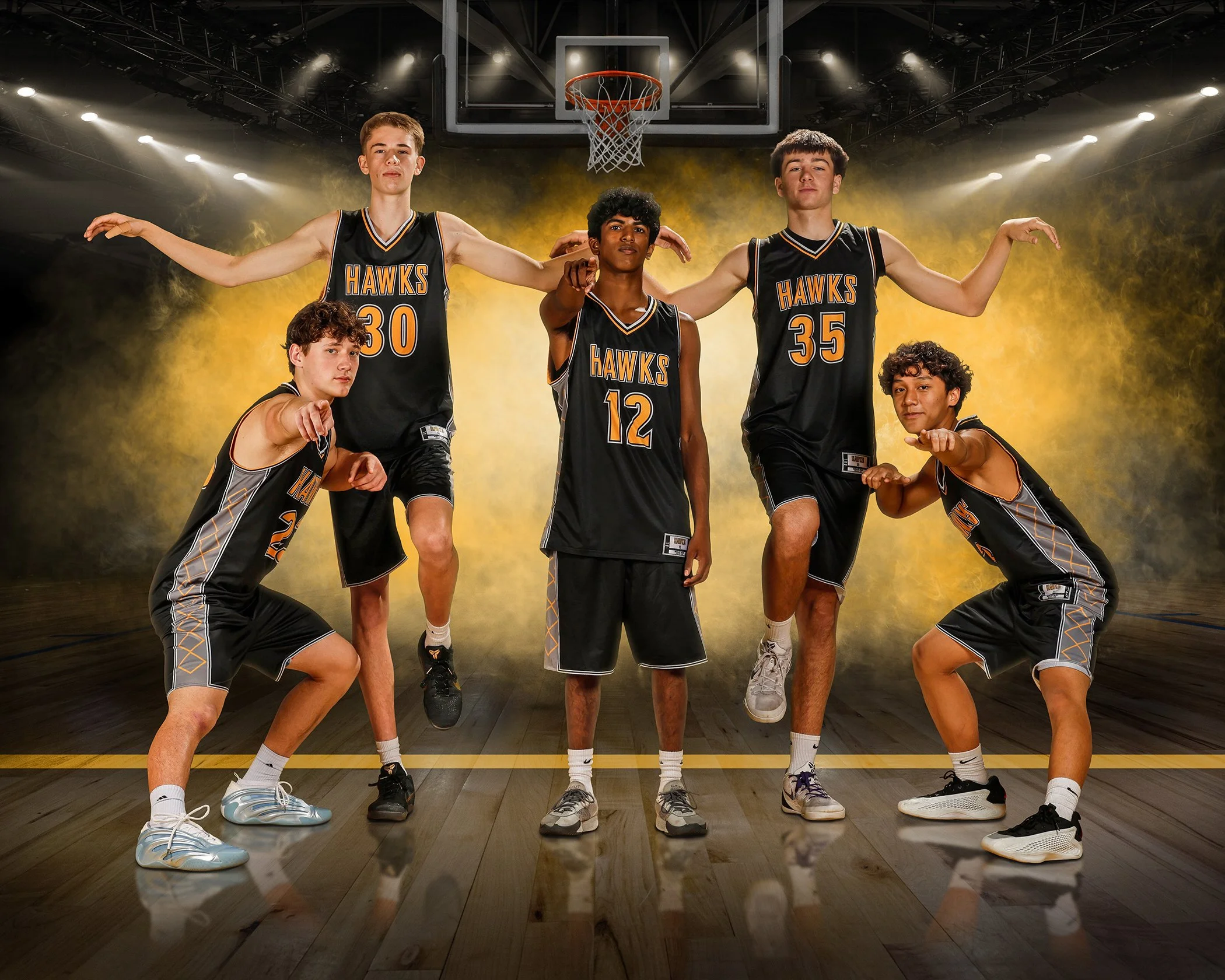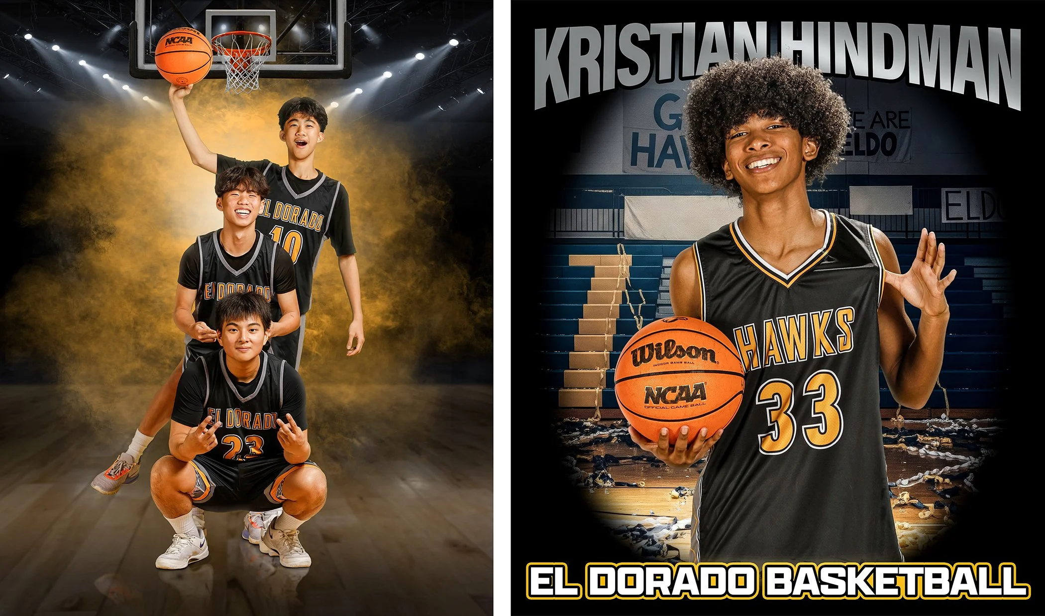 This one is in danger of over-sharing but we did some cool stuff this year! Probably my best Photo Day every year. The participation is always about 100% and the booster parents collect the forms and organize everything for me. A lot of kids do bonus stuff with friends or for media guide dedications. I removed the non seniors from the team banner and reconfigured them to fit on the media guide cover. The gym wall portraits are clean and use a similar backdrop to the large banner. My first time offering t-shirts to everyone and sold 10 (Brian’s family will be well decked out with 7 shirts!) We shot this with the cheerleaders taking up half of the gym the whole time, screaming “Let’s Go ELDO!” The Varsity Team Photo had 5 people added to it, I’m a Photoshop Ninja. Another cool thing this day was my brother was visiting from out of state and got to help me out and see firsthand how crazy these days can be! Here is the 2026 El Dorado Basketball Gallery (CLICK). B