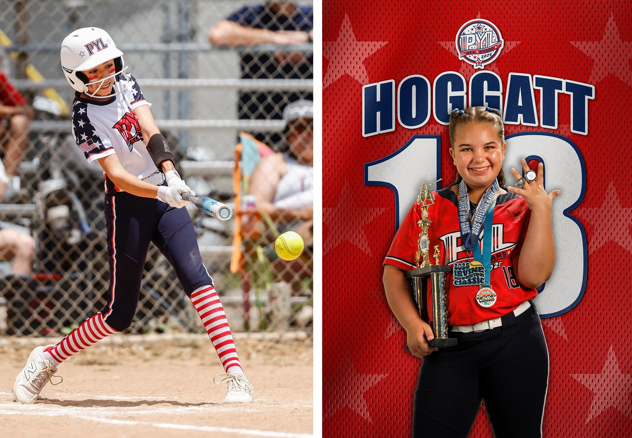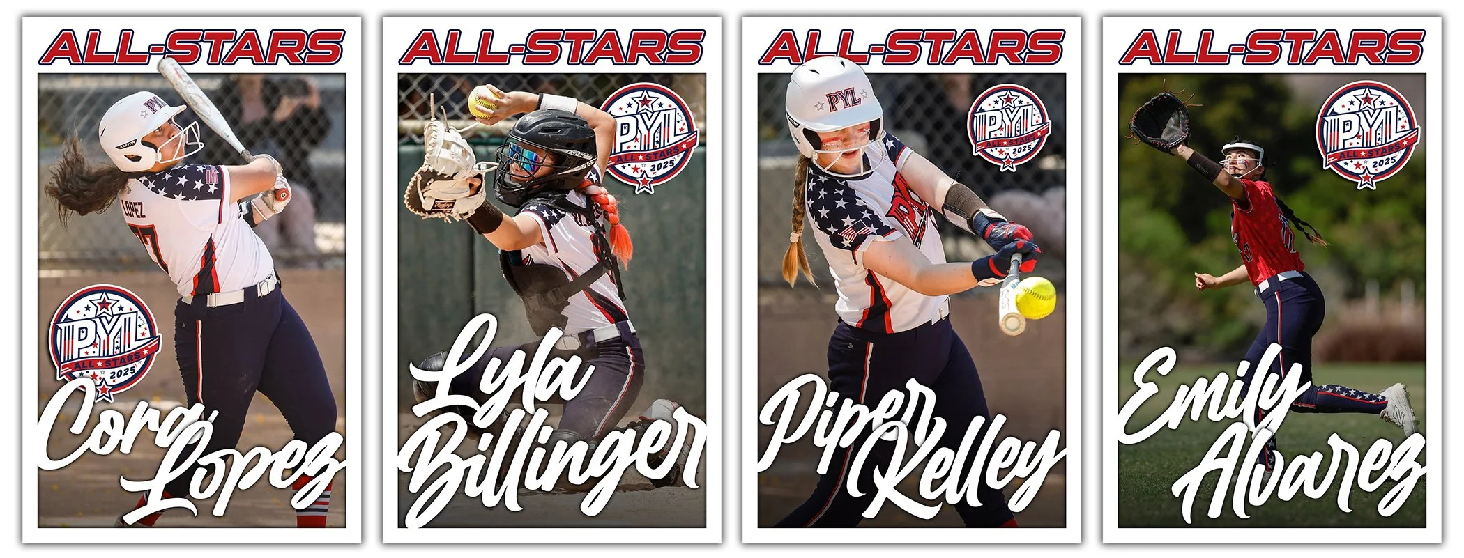 Here it is, the first full summer package. This is the 12U White with a bunch of returning players from last summer and a few new ones! I shot these girls three times actually and a warm up session at Eastside. The first game I shot them at Golden they were losing by 5-6 runs and pulled out the most unlikely comeback against Santee as Piper had the walk off hit. I shot them at Eastside versus a tough Tustin team that simply hit the ball “where they ain’t”. There would be no comeback this day. I caught up with them for a bonus game in the Irvine Tournament. I honestly can’t remember if that was a win or loss, but judging from the photos we had a lot of hits and base runners! In addition to the Team Bulletin Board above we did trading cards and each girl got an Action Monster Print. We didn’t do a team visit to the studio but Janelle came in for a session, always fun for me to have the kids come in. The slideshow turned out great and was shown at the Team Party that was earlier today. Here’s the high resolution gallery with downloading (instructions) turned on. Thank you, B. The 2025 PYLGSA 12U White All-Stars Gallery (CLICK). B