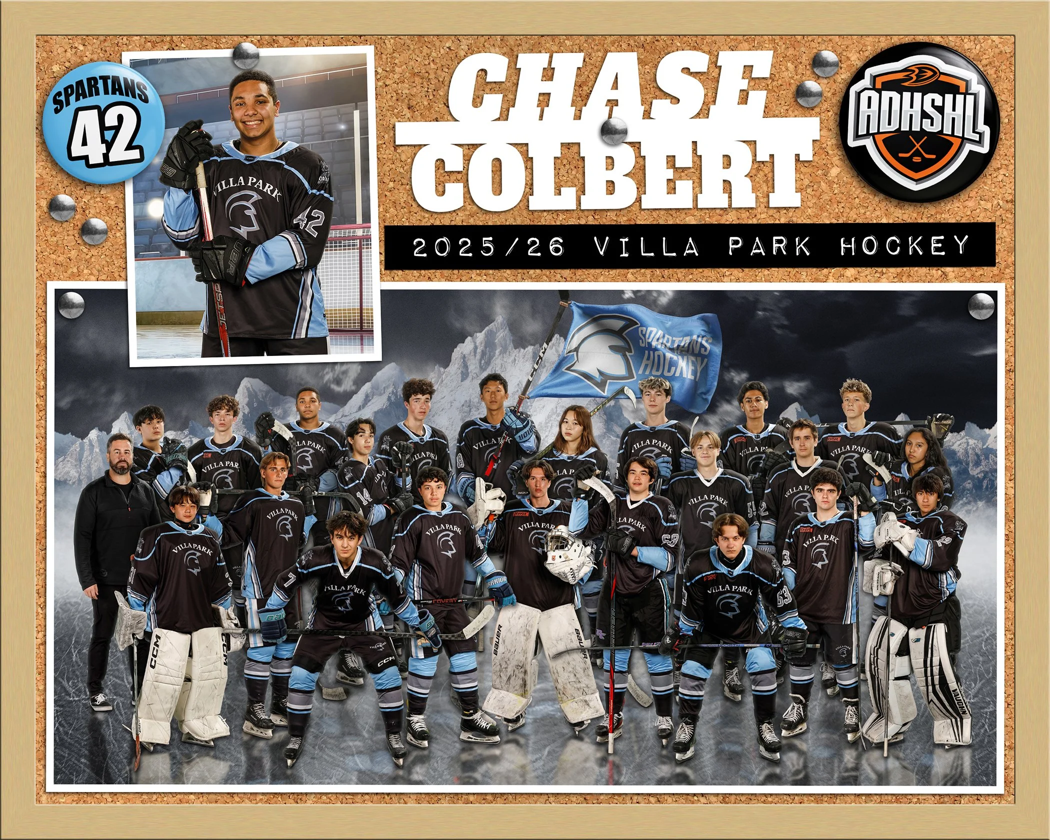 My 4th year with Villa Park Hockey! After the season ended last year I had Aaron in for a Senior Studio Session, fun to get to create special stuff. I might have covered this before but it’s worth repeating. Because there are so few high school hockey players, most of the teams have a combination players from surrounding of schools. This team has kids from 8 different schools, with six actually attending Villa Park. For those guys put together a separate group photo for their yearbook (below). There’s 4 from Troy and 4 from Oxford Academy (Cypress). Other schools too, but that’s the bulk of the kids. We did banners again for the seniors and all players are getting my 8x10 custom scrapbook bulletin boards. There’s loads of unused poses in here so if you want to have me work on something send me a note! Here is the 2026 Villa Park Gallery (CLICK). B