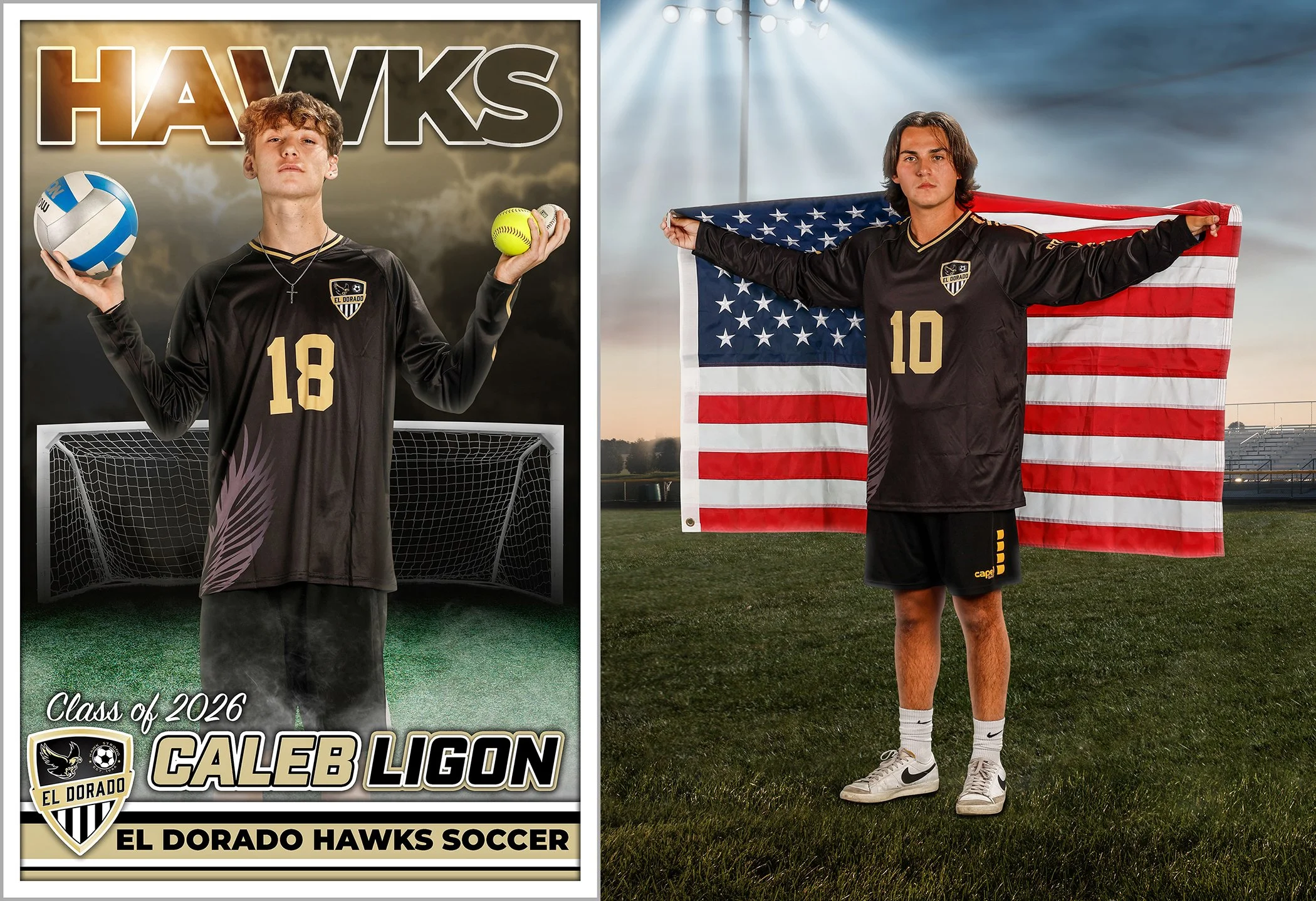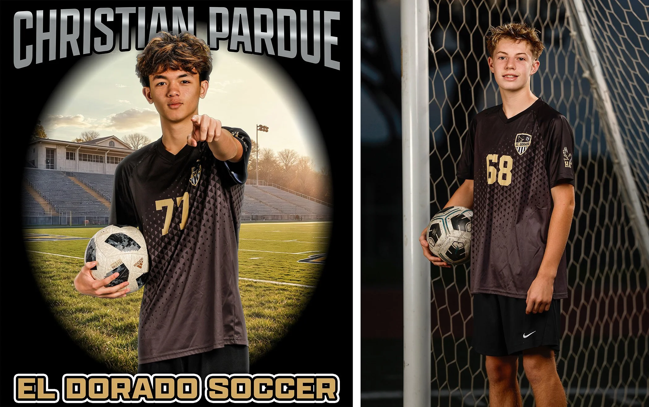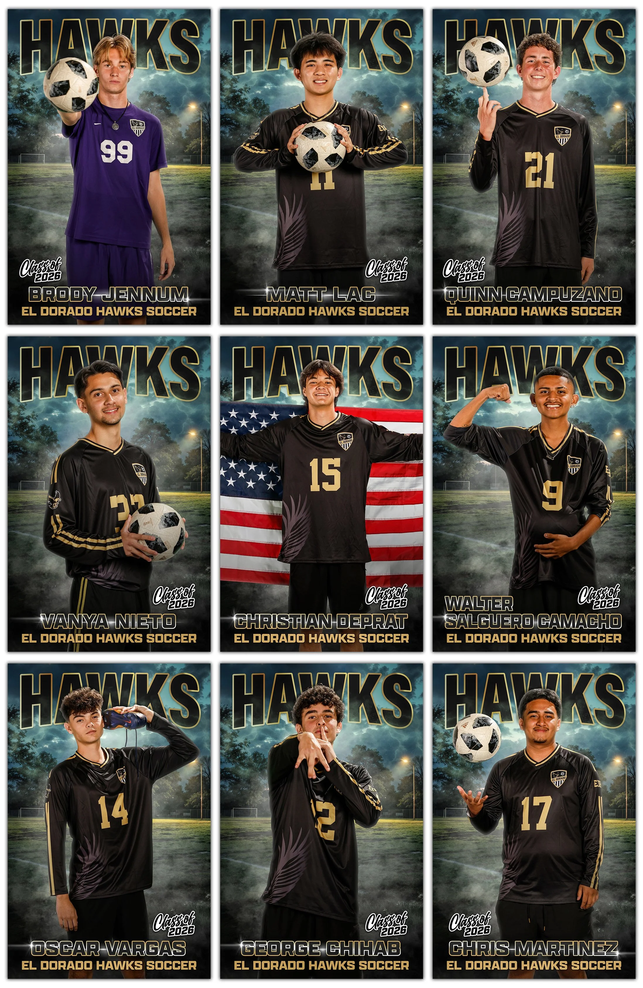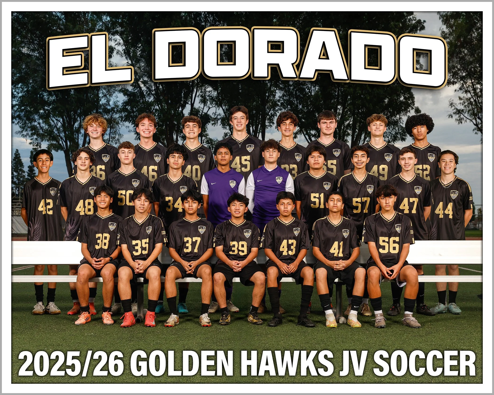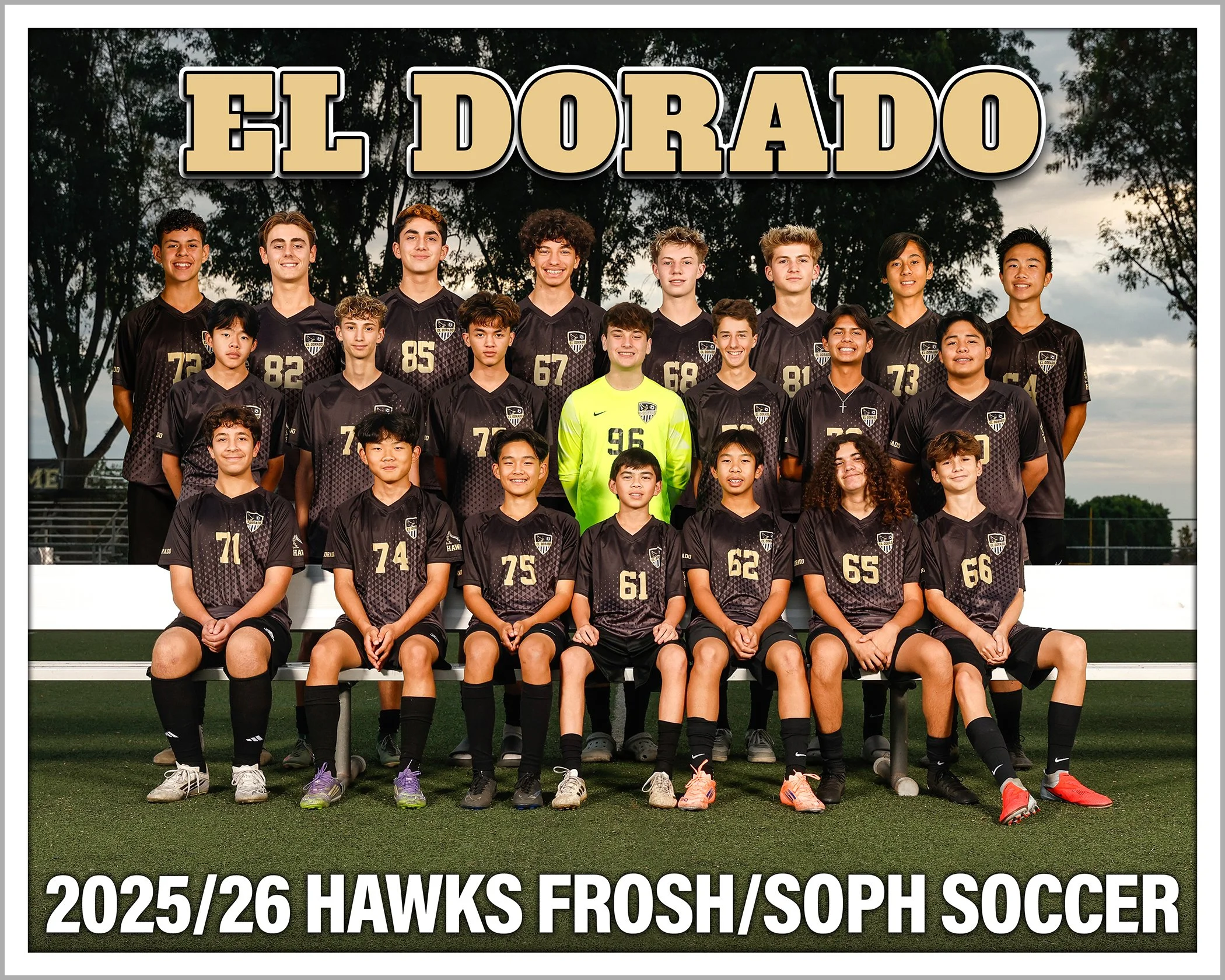 A lot in here on this one. There was 19 seniors on the team this year which made the Personality Pose (above) a real puzzle to fit all the boys in. I love it. Photo Day was a challenge because it was cloudy, that’s not usually a problem but we didn’t factor in the Daylight Savings that kicked in that week so we started with an hour of light gone! You’ll notice that the Varsity individuals are in the daylight, while Frosh Team is in the dark! As soon as I realized we were in a pickle we stopped individuals and had all three teams do the team photos. The kids were scattered because they were recording fundraising videos on campus but my helping parents rallied them all very quickly. Because we knew we were missing boys (band competition) from each team I shot the front two rows and then the standing back row separately. I figured I could add the band kids to the back row easier that way. Here is the 2026 El Dorado Soccer Photo Day Gallery (CLICK). B