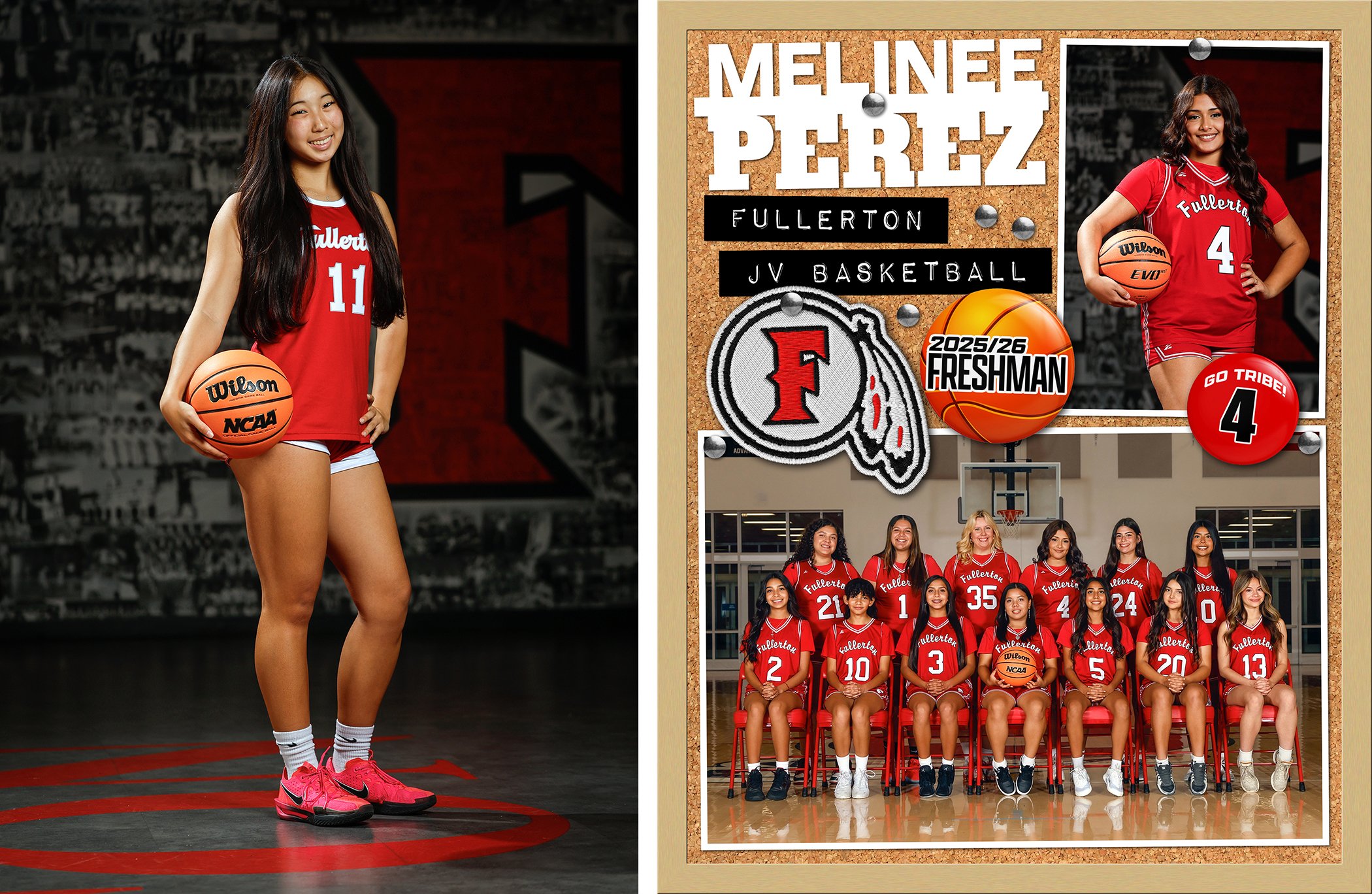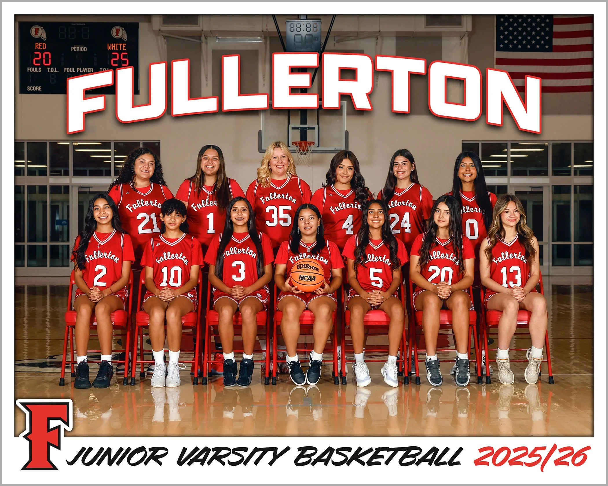 Sometimes I can’t believe how fast time flies. This is my 4th year shooting team photos for the Fullerton Girls. Of the four years we’ve only done individual photos in the gym once. There’s a lot of competition for the gym time and we only get enough time to shoot the two teams in there. One year we even had to find a spot outside! The last couple of years we have shot individuals in the gym lobby. Surprisingly awesome look! Maybe next year I’ll bring the green screen just to mix it up for the girls. The team is covering my 8x10 Bulletin Boards for each girl. I made buttons with year and position and put those on there if provided. Of course you are still welcome to purchase team or individual prints. Here is the 2026 Fullerton Basketball Gallery (CLICK). B