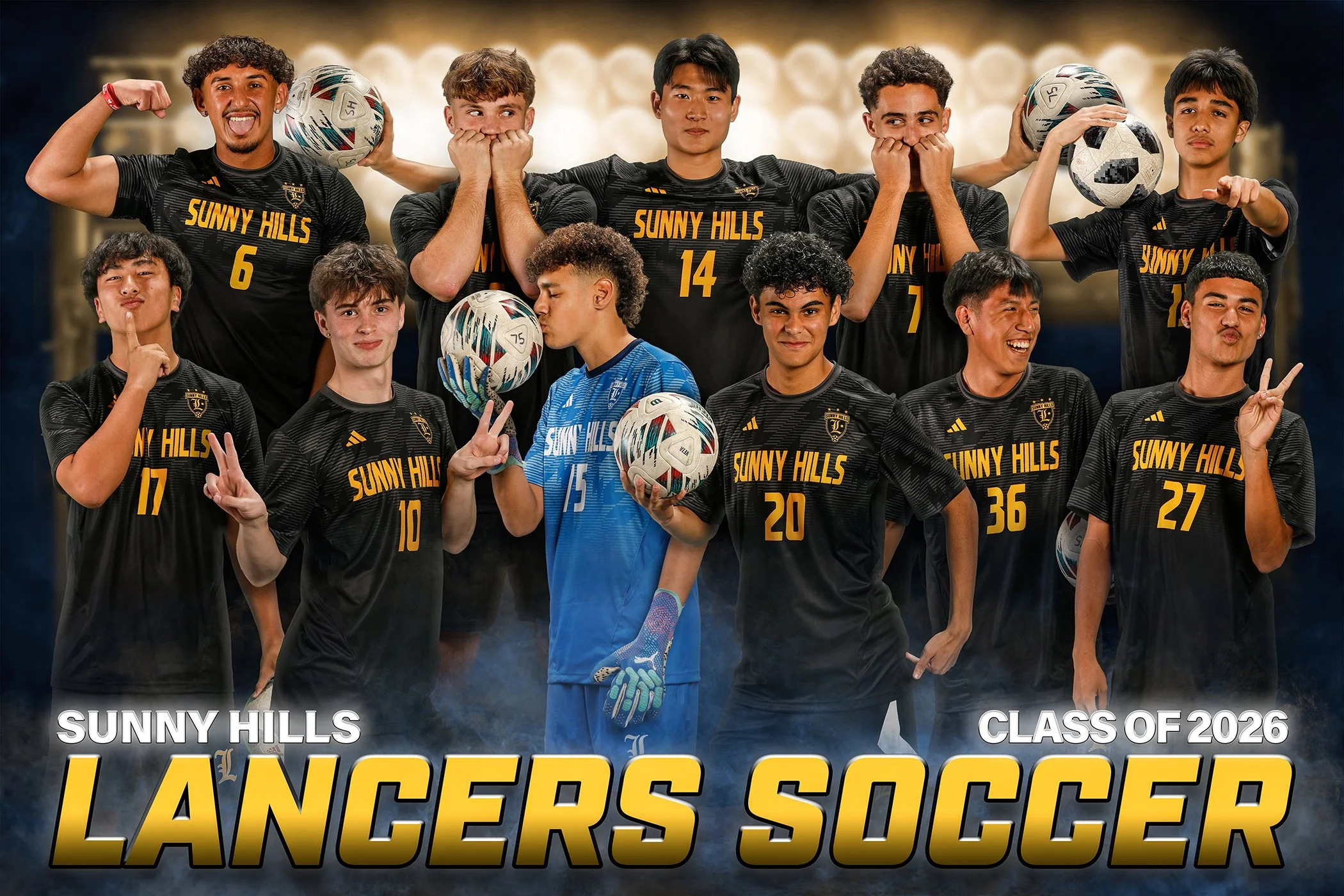 A lot in here. Coach does things in reverse here, like the pro teams do it. We shoot team photos at the end of the season with the reasoning that team photos are accurate because of roster changes during the year. We did banners earlier at the studio, including the senior personality group pose. We had some Trading Card and Monster Prints ordered and all the prints are on their way. Doing it backwards does have it’s cons though. Since I don’t know who might order action stuff, that option is out the window. Another one is yearbook is definitely waiting for these team photos to finish up the winter section! The banners are hot! Here is the 2026 Sunny Hills Mens Soccer Photo Day Gallery (CLICK). B